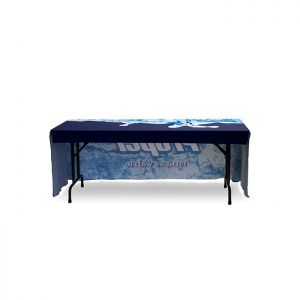 • This custom table cover is ideal for use at a trade show or career fair. Use this printed tablecloth to add an element of color to a table display. Passersby will be more inclined to stop and take notice of this custom table drape rather than the standard plain throws.
