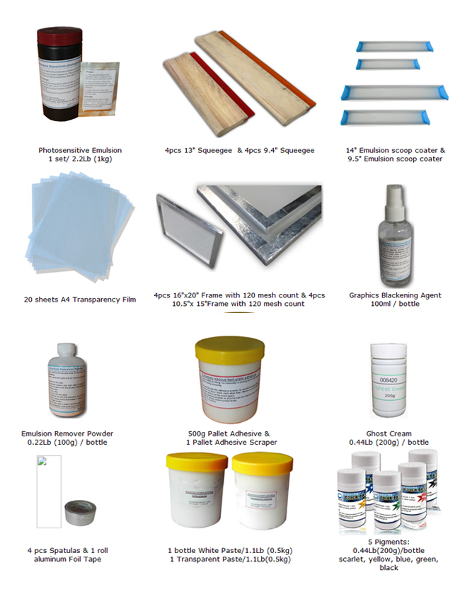 This kit is especially designed and equipped for new hand to learn and do your DIY screen printing. Except for the screen printing equipments, it nearly includes all the materials for doing T-shirt screen printing; Another important thing is that we will also provide the full set of technical support. Besides, if you want to buy the screen press, screen stretcher, exposure unit, flash dryer and other screen printing equipments, you can also find from our warehouse or just contact with us. So why still hesitate? Act now!!!